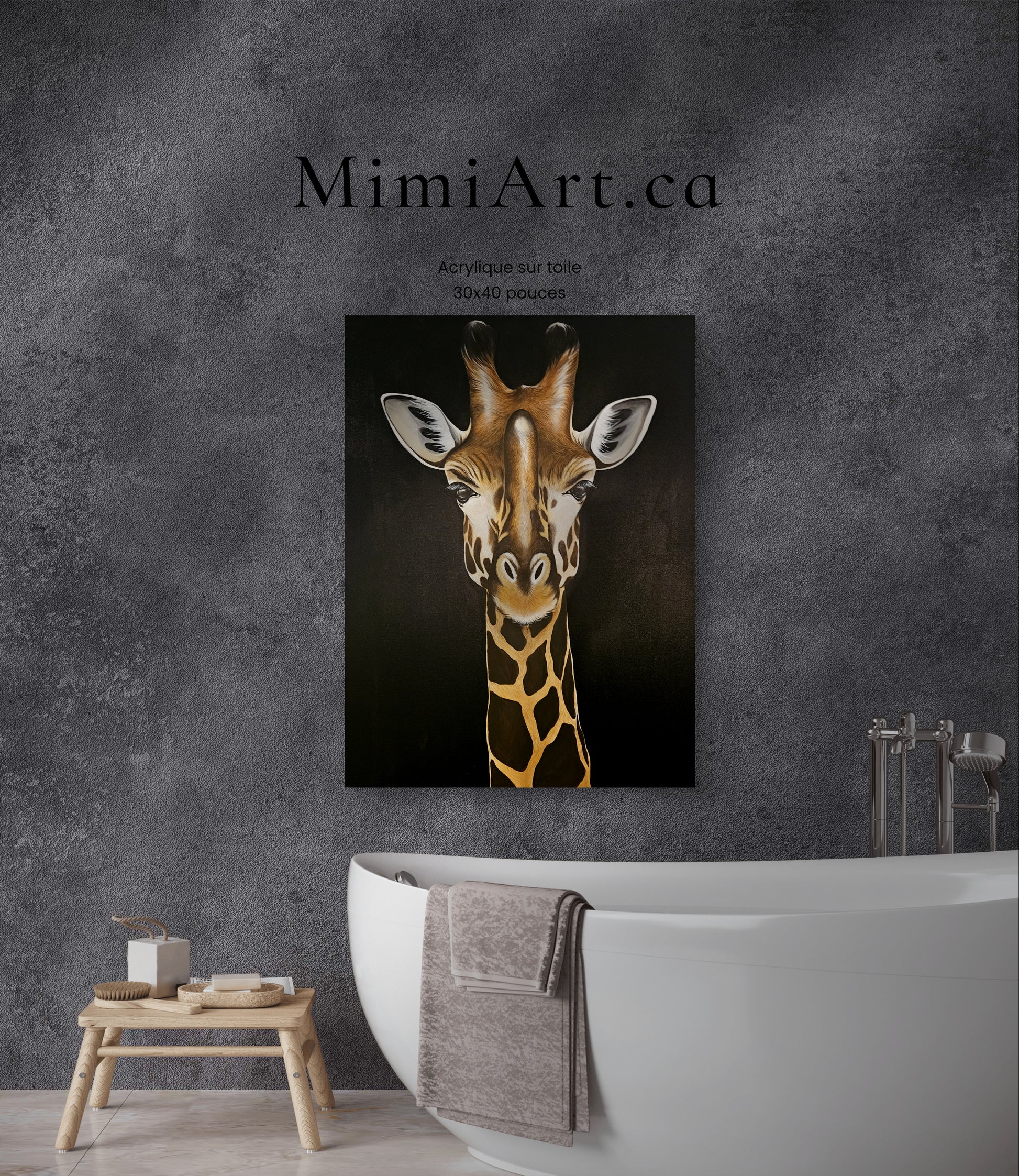 Regard perçant et majesté élancée, cette girafe hyperréaliste capte l'essence même de cet animal fascinant. Sur un fond noir profond qui accentue chaque détail, son pelage minutieusement peint révèle des nuances riches et un jeu subtil de lumière et d'ombre. Son regard doux mais intense invite à une connexion presque intime, capturant l'élégance et la sérénité de la nature sauvage. Cette œuvre allie précision technique et émotion pure, offrant une présence saisissante et intemporelle.